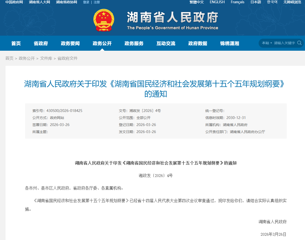 近日,湖南省人民政府正式印发《湖南省国民经济和社会发展第十五个五年规划纲要(2026—2030 年)》,明确提出到 2030 年,全省风电、光伏发电装机规模达到 5500 万千瓦(55GW),彰显湖南加速能源绿色低碳转型、构建新型能源体系的坚定决心。此次规划目标较此前版本大幅上调,标志着湖南新能源发展迈入提速提质新阶段。